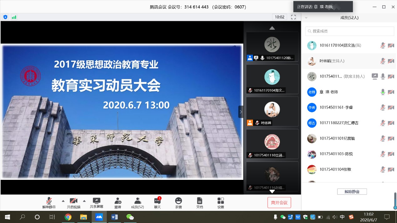 2017级思想政治教育专业实习动员大会于2020年6月7日下午13:00在腾讯会议线上顺利举行,美女自慰 副院长许瑞芳及章瑛、史俊、翟贤亮和叶林娟等老师参加,会议特别邀请了何静、李睿、朱诗妤三位学长学姐进行经验分享。