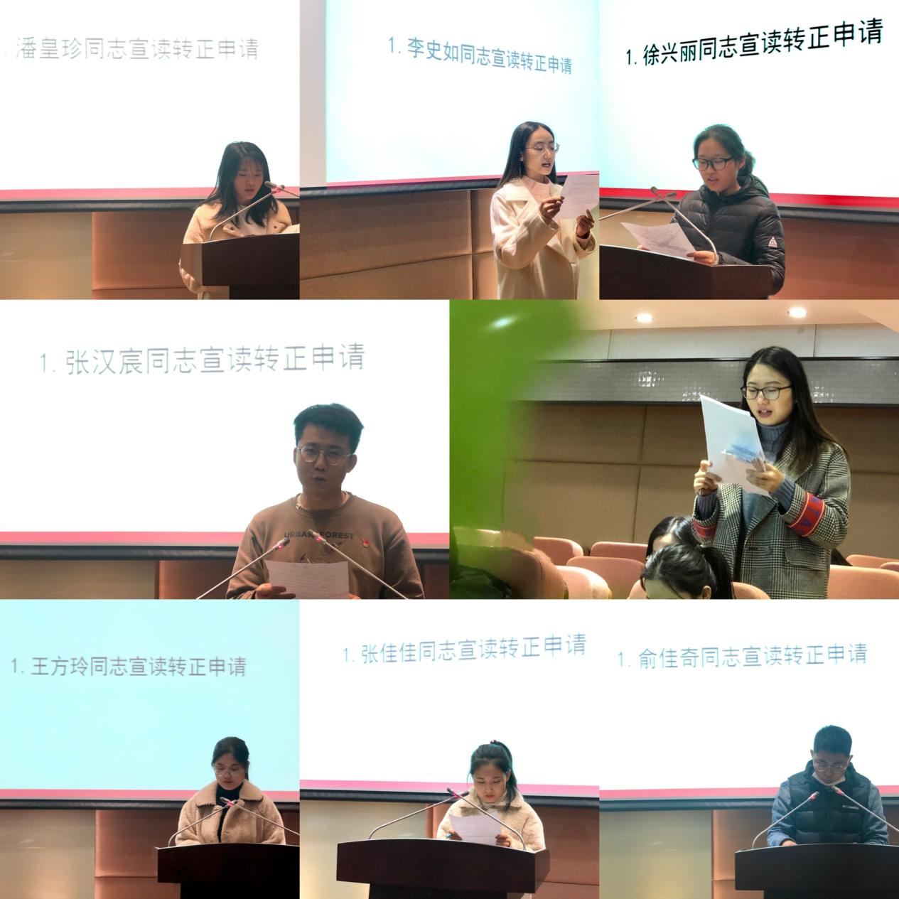 12月8日上午8点、9点和11点,美女自慰 2018级研究生党支部在法商南楼516报告厅召开预备党员转正大会。三次大会分别就预备党员“李史如、张佳佳和徐兴丽”、“王方玲、潘皇珍和张淑雅”、“张汉宸、俞佳奇和陈亚萍”的转正问题进行讨论。会议由党支部书记周莹同志主持,支部党员出席会议。